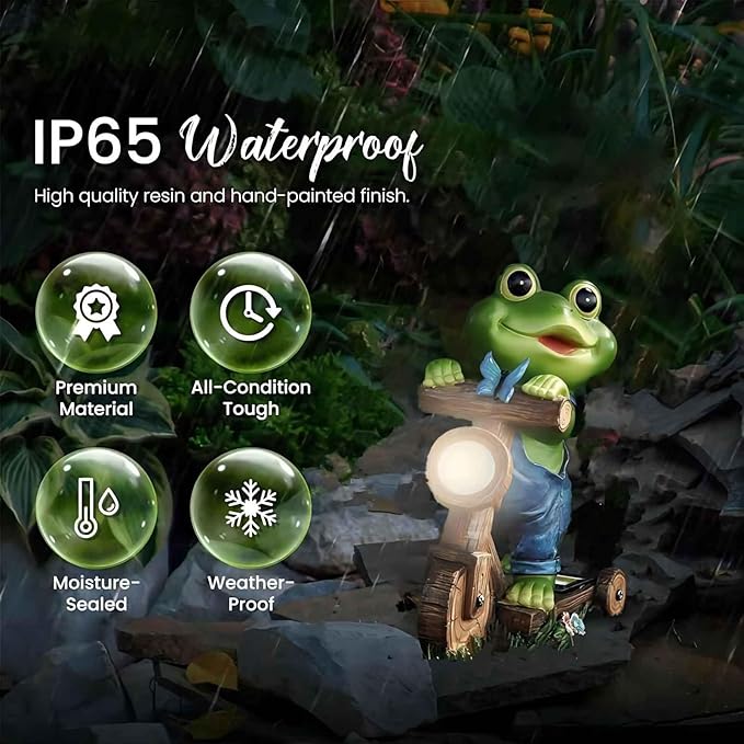 - 【𝐂𝐔𝐓𝐄 𝐅𝐑𝐎𝐆 𝐅𝐈𝐆𝐔𝐑𝐈𝐍𝐄𝐒】 How funny and adorable solar frog garden decor it is. This outdoor frog garden decorations will into your heart. Its design is so unique and modern, a lovely and vivid frog sitting on a small bike/bicycle, which makes you feel very interesting and surprising. it is fun to your garden,study or balcony. In addition, its hand-made production process is also very fine, and the detail is handled very well, which makes you feel very satisfied. Overall, this solar frog yard statue is an excellent artwork that will add a unique charm to your living area, whether it is placed in the garden or on the balcony.