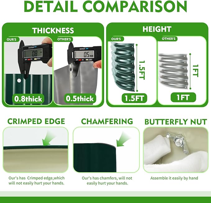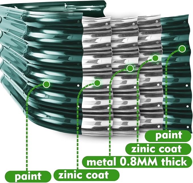 - Materials and Construction: The raised garden bed kit is constructed with sturdy metal 0.8mm thick, providing a reliable framework for your garden. The oval-shaped design adds a unique aesthetic,and the 17" height provides ample depth for plants