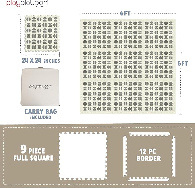 Play Platoon Non-Toxic Large Kids Mats for Floors, 9 Tile 72 x 72 inch, Extra-Thick Interlocking Tiles, 24 x 24 in. Puzzle Mat Pieces with Border, Neutral Playmat Rug for Toddlers & Children