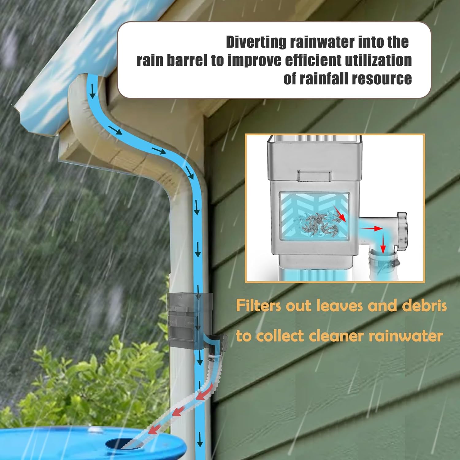 - Enhanced filtering rainwater collection system, is equipped with a removable filter cover and filter net, could filter out large leaves and other debris, not causing downspouts clogging, collected cleaner water.