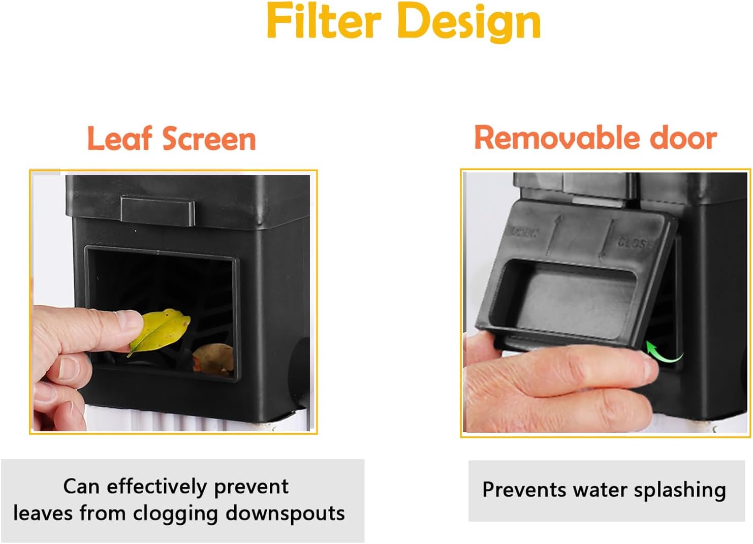 - Enhanced filtering rainwater collection system, is equipped with a removable filter cover and filter net, could filter out large leaves and other debris, not causing downspouts clogging, collected cleaner water.
