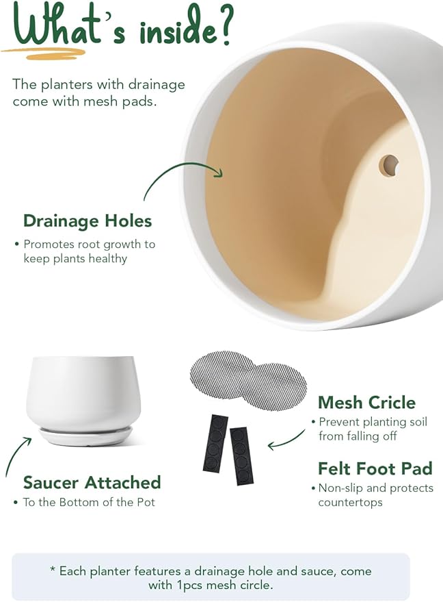 - Versatile Set: This planters includes 2 sizes—10 inch and 12 inch body sizes—with an 8 inch opening for the 10 inch planter and a 9.8” opening for the 12” planter, offering the perfect balance of style and practicality. With drainage hole, saucer, mesh pad, and rubber feet, it ensures healthy roots and a tidy home. (Plants not included; tray are one-piece design)