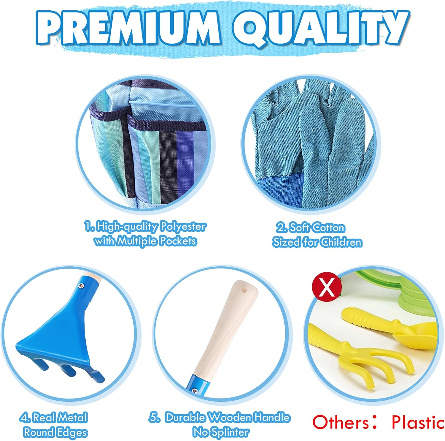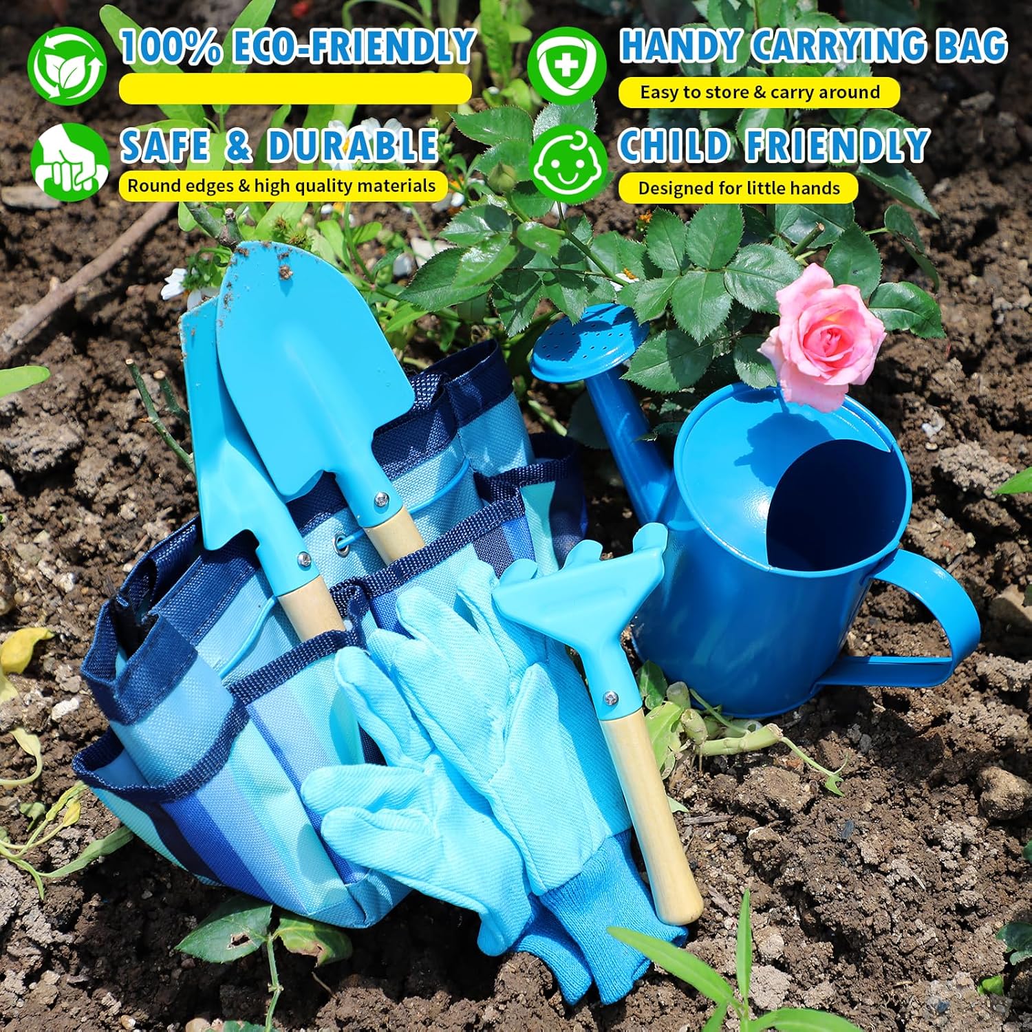 Kids Gardening Tools Set, Toddler Play Kit Child Outdoor Toy with Gloves, Watering Can, Metal Shovel, Rake, Spade & Storage Bag, Backyard Sand Digging Birthday for Boys Girls 3-5 (Blue)