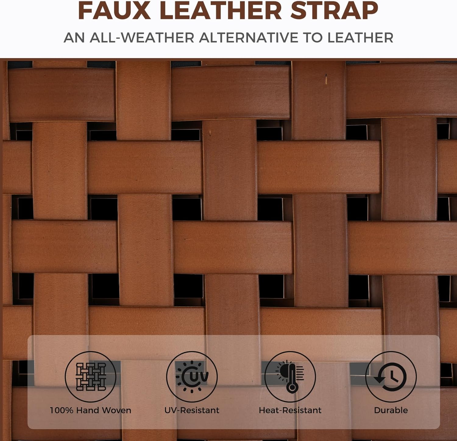 - LEATHER-LOOK:Bold and beautiful! Our handwoven wide strap faux leather is tested for year-round outdoor resilience with enduring beauty and strength, delivering a leather look without extra maintenance! Rated at 2000 UV hours, it is easy to clean and extremely resistant to the sun, rain, heat, and cold to not crack, sag, or fade. Due to lighting issues, the back of the chair may have a slight color difference