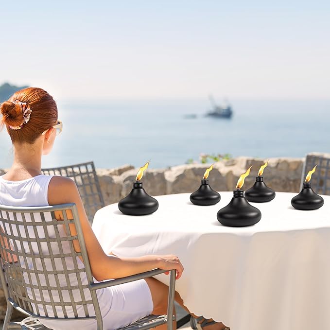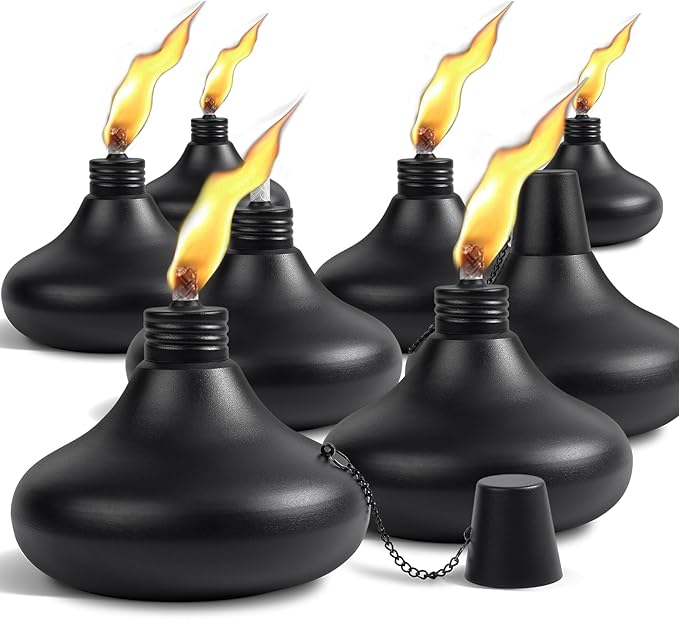 - 💝Large Capacity: Each tabletop torches hold approximately 24 oz of fuel, allowing the burning time more than 10 hours. Recommended using a funnel when filling torches with oil. It is easily available in the market. Please use snuffer to put out flame and protect the wick after use.(Note: These torches do not contain fuel)