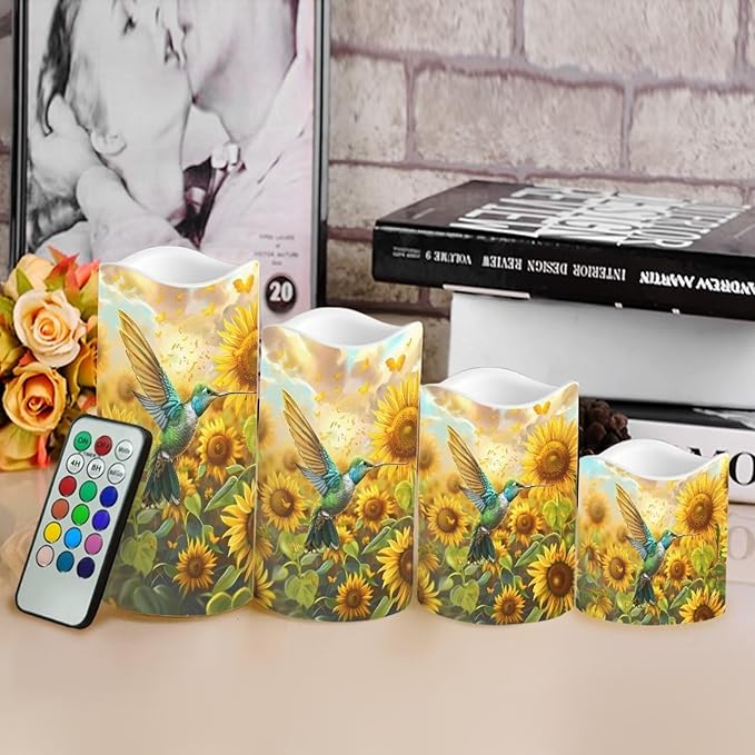 Ystardream Operated Candles with Flickering Flame Flameless Taper Candles Flickering Operated Electric Pillar Candle LED Candle for Indoor Outdoor Home Decor Hummingbird Sunflower