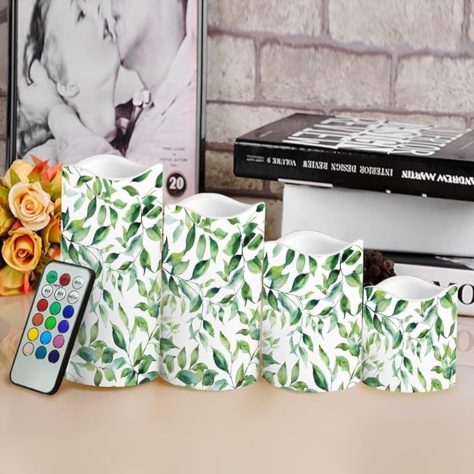 Ystardream Green Leaf Flameless Candles with Timer 4 PCS Led Candle Battery Operated Fake Candle for Indoor Outdoor,Virthdays,Christmas,Thanksgiving,Valentine's Day