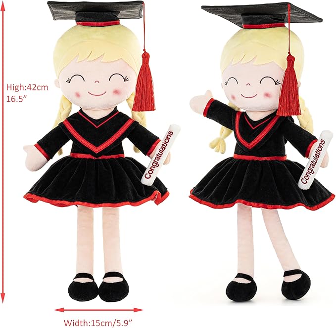 - ๐ค Generously Sized 16 Inches โ At 16 inches tall, this plush doll is large enough to stand out as a centerpiece in graduation celebrations while still being soft and lightweight for everyday cuddles. Its perfect size makes it an ideal graduation present plush toy for toddlers and kids.
