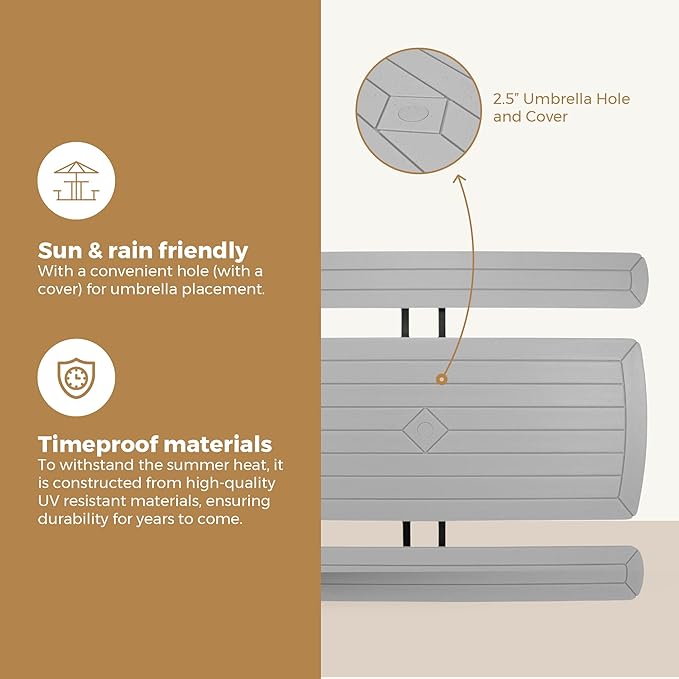 - Versatile Outdoor Companion: Designed for al fresco dining enthusiasts, our picnic table transforms outdoor spaces into vibrant hubs for shared experiences and cherished memories. Folds flat to 3" height for storage during winter and features a convenient hole (with a cover) for umbrella placement, ensuring shade on sunny days.