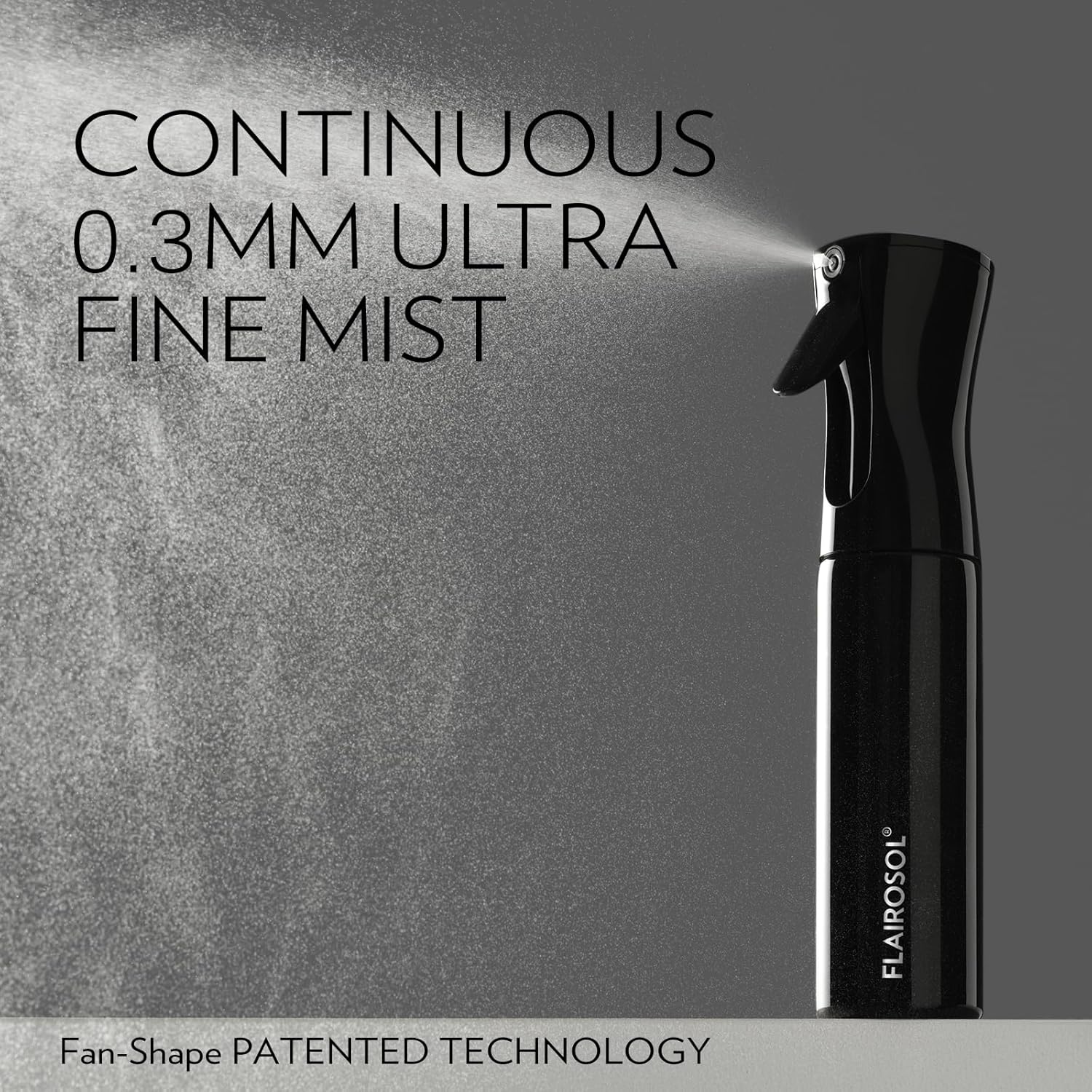 FLAIROSOL Spray Bottle for Hair, Continuous Spray Bottle with 0.3MM Ultra Fine Mist, Water Mister for Hairstyling, Cleaning, Plants, Pets, 10.1oz/300ml, Black Bottle, White Print