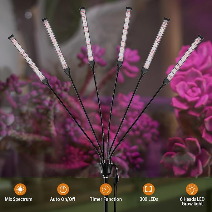 - 【6 IN 1 -360 LEDS -WIDER COVERAGE 】The full spectrum grow lights for indoor plants consists of 360 efficient grow LEDs (105 white, 198 red, and 54 blue) and 6 light heads up to 8.3 inches long, The number of LEDs is several times more than other grow lights on the market, and increase the intensity of light by up to doubled also, provides a much wider coverage and makes your plants get more intense light in all growth stages.
