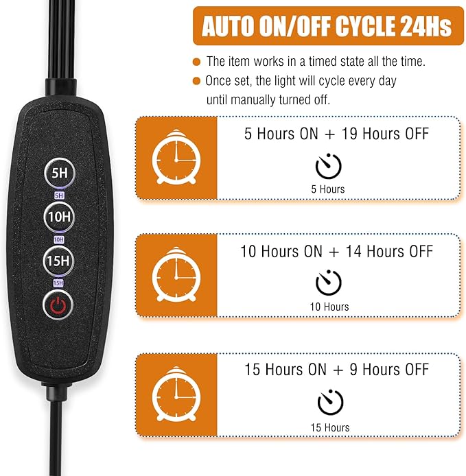 - 【PERSONAL PLANT ASSISTANT】Default timer of 5 hours upon startup, the grow light works in a timed state all the time, The timer function of the growth light allows for 5/10/15 Hours timing for plant needs. Once being set up, the grow light will automatically turn off after set hours, For example, if you set it for 5H at 6:00 a.m., it will automatically go off at 11:00 a.m. Then at 6:00 am the next day and turn off at 11:00 a.m. again. It cycles like this every day!so you don't have to worry about your plants even if you go on a trip.