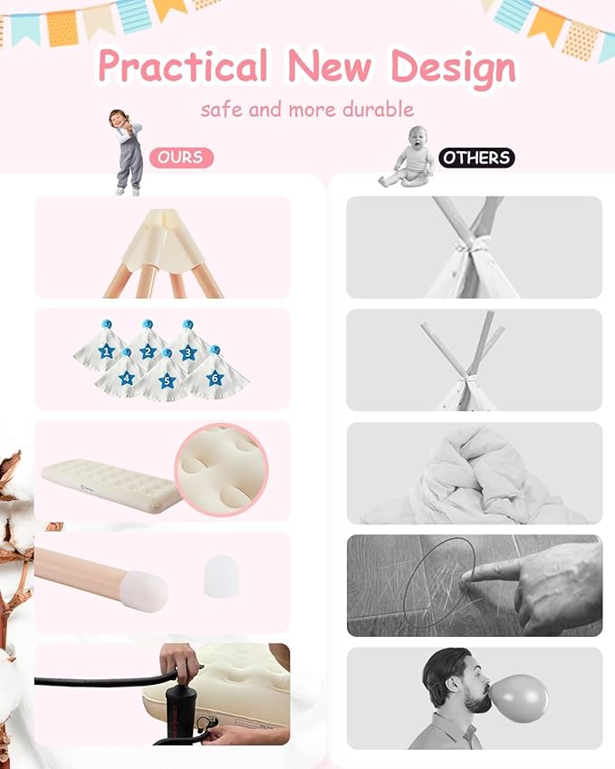 - More stability and Security : More stable thanks to the Teepee stabilizer and rubber stoppers on the legs, that helps it from sliding, without the risk of folding or collapsing. Small toddler teepee window for good air circulation and play peekaboo with kids.