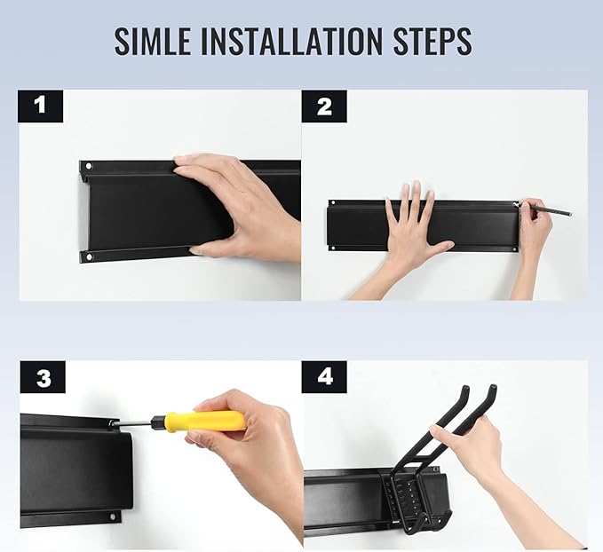 - EASY TO RELOCATER & ADJUSTABLE: The Garage Storage system with 6pcs Steel wall racks (16 inch), 12pcs Double Hooks (10 inch), Garage hooks can be easily repositioned anywhere on tracks of the panel when storage needs change. And fast wall-mount hooks can install in a snap.