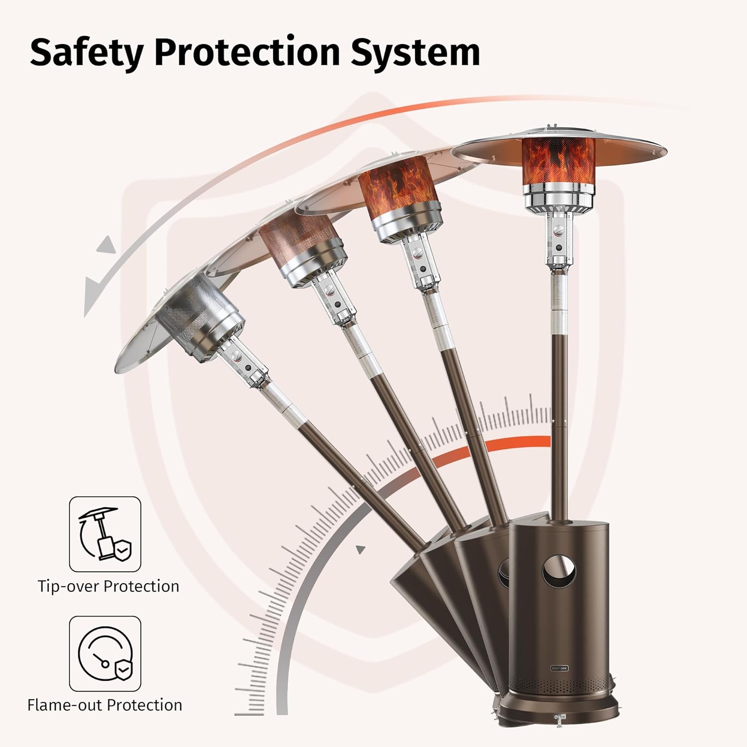 - 𝗗𝗼𝘂𝗯𝗹𝗲 𝗦𝗮𝗳𝗲𝘁𝘆 𝗣𝗿𝗼𝘁𝗲𝗰𝘁𝗶𝗼𝗻 𝗦𝘆𝘀𝘁𝗲𝗺: The Tip-over Protection system will shut off the flame when the patio heater propane is tilted more than 45 degrees. If the flame goes out, the Flame-out Protection system automatically shuts off the gas supply