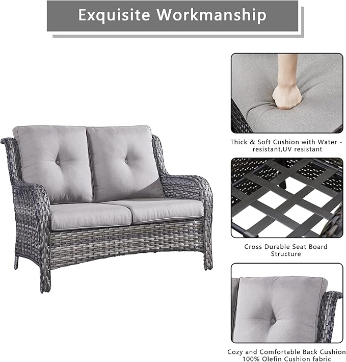 - 【Comfort Cushions & Deep Seating】This patio wicker swivel chairs and loveseat feature deep and wide seats,with 4-inch thick sponge-padded seat cushions,5-inch back cushion create the ultimate patio seating experience.