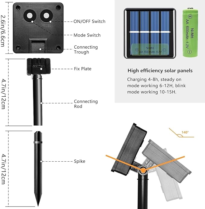 - 【8 Twinkle Modes & Memory Function】: These solar mini lights have the mode button and ON/OFF button. You can select 8 different modes to satisfy your diverse needs: combination, in waves, sequential, slo-glo, chasing/flash, slow fade, twinkle/flash, steady on. And the built-in memory chip saves your last modes setting, so there is no need to reset it again.