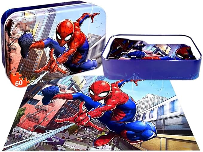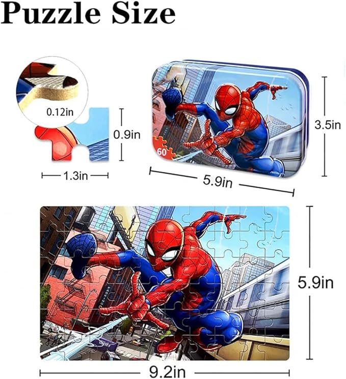 - Portable Puzzles for Kids ages 4-6 Compact metal box (5.5x3.6x1.4") stores neatly and travels easily. 60 piece educational puzzle builds focus creativity,perfect for boys and girls ages 4-6.