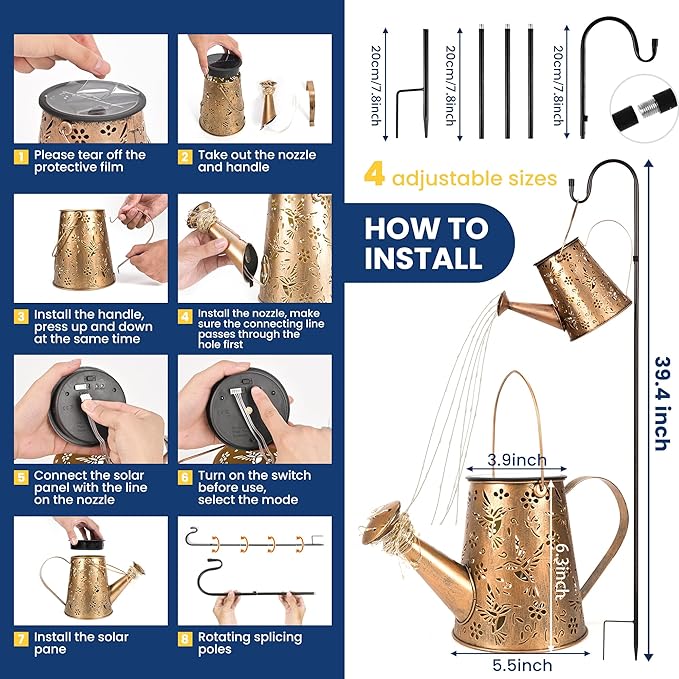 - Dimensions and Specifications: The solar garden light is made of durable metal, including the watering can body, spout, and handle. It comes with a ground stake composed of five 7.8-inch sections, allowing you to customize the height as needed