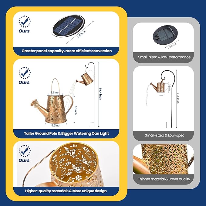 - Unique Outdoor Decor: Solar Garden Lights with a unique watering can design and hummingbird cutout, projecting light spots in multiple directions. The spout's light strands mimic watering and it can be used in combination with greenery, sculpture