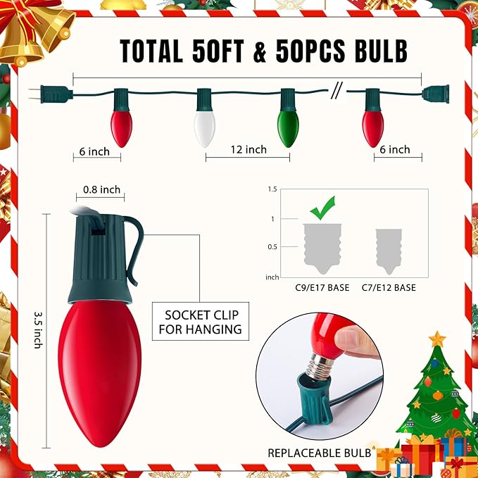 - 50 FT Vintage Outdoor Christmas Lights: 50 feet length with 50 +2 C9 bulbs (2 spare), E17 base light sockets.Red Green and White