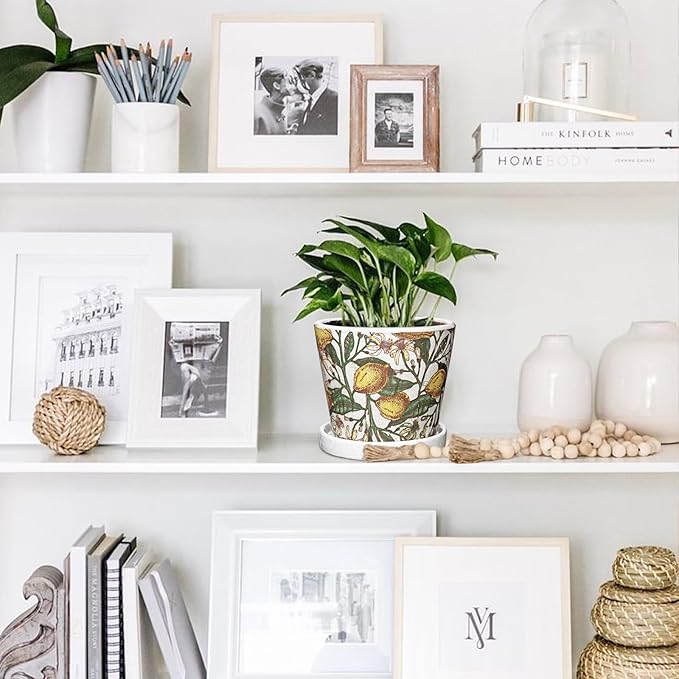 5.5 Inch Decorative Plant Pots, Round Ceramic Planters for Indoor Plants Pots with Drainage Hole Saucers, Lemon Green Leaves Ceramic Flower Pots Retro Planter Pot for Succulents Cactus Outdoor Garden