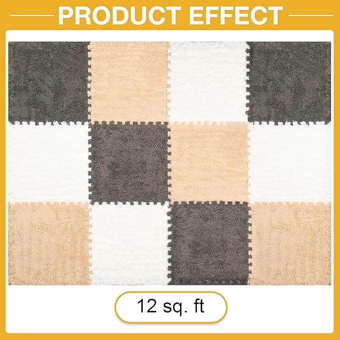 12 Pcs Plush Interlocking Carpet Tiles, Non-Toxic Foam Carpet Tiles for Toddler Baby, Machine-Washable, Anti-Slip, EVA Foam Interlocking Tiles for Floor, Nursery, Grey White Light Brown