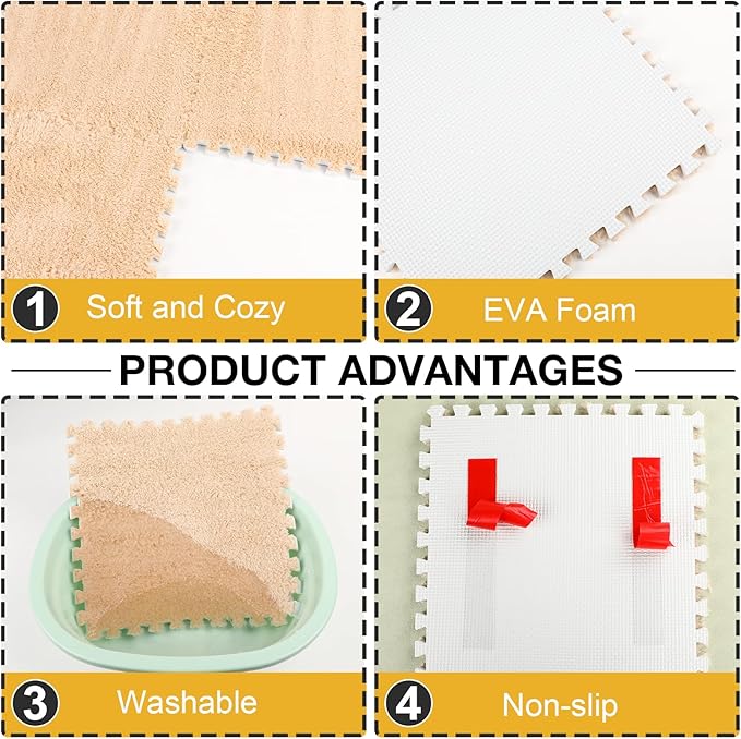 - DURABLE, THICK, SOFT & COMFORTABLE: Each piece of plush puzzle foam floor mat is made of thick EVA foam,it will be very durable; in addition, the surface is covered with soft and cozy coral velvet, which is very soft to use and provides a safe and comfortable place for your children to play