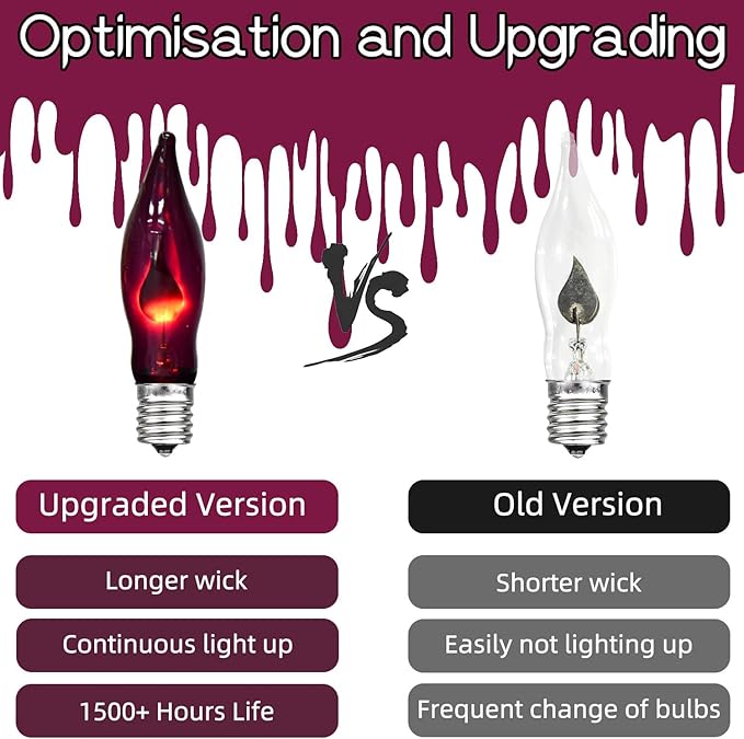 - 🔥【Realistic Flickering Flame String Lights】: 12.8 Feet 10 Halloween Flickering Flame String Lights comes with 12pcs 1W clear orange and purple flame bulbs (2 spare bulbs), fit for C7/E12 screw base,black wire. Flame bulbs power on the flame flickering effect realistic, like dancing little gremlins, mysterious and charming, add charming and fun glow to your Halloween decorations.