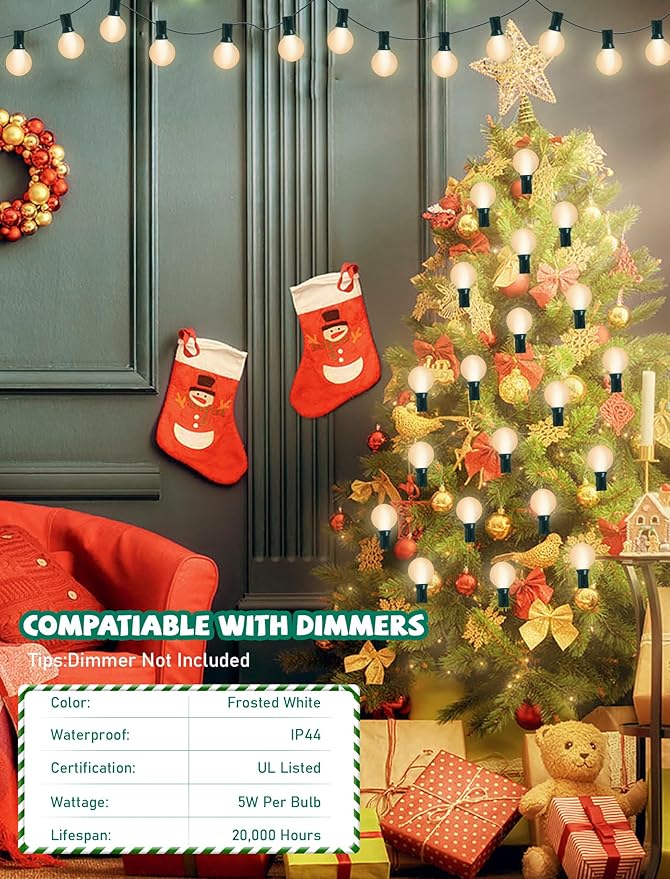 - Christmas Decorations light string: G40 frosted white bulbs globe string lights emit a soft, warm glow, perfect for creating a relaxed, inviting atmosphere for both indoor and outdoor settings. Whether you're stringing them along a fence, around your backyard, or above an outdoor dining area, outdoor string lights are the perfect decoration for Christmas, Halloween, Thanksgiving, weddings, birthdays and other holiday parties, adding a romantic and warm atmosphere to your venue