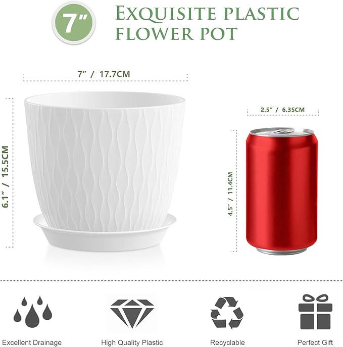 7 inch Plant Pots, 5 Pack Flower Pots with Drainage Holes and Saucers for Indoor Plants, Plastic Planters with Water Ripple for Small Garden House Plants, Nursery Pots for Succulent, White