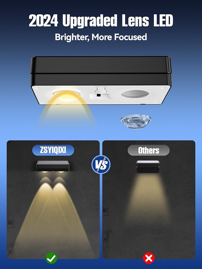- 【New Upgraded LED with Lens】Our fence lights solar powered feature an innovative optical lens design that effectively concentrates diffused light into a V-shaped beam, creating a more focused light output and a wider illumination area. Measuring 3.9 x 1.9 x 1.3 inches, these compact solar fence lights outdoor maximize functionality without overwhelming your space. Elevate your outdoor garden with elegant lighting that enhances both aesthetics and safety