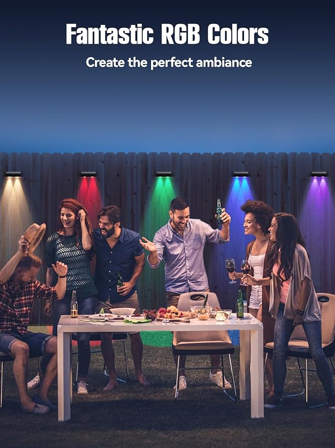 - 【10 Lighting Colors & 12 Modes Solar Fence Lights】Decorate your outdoor areas with our RGB fence solar lights! With 10 vibrant colors and 12 lighting modes, you can easily create the perfect atmosphere. Warm White are ideal for everyday lighting, while the RGB modes add lively colors, perfect for festive decorations or special occasions. These fence lights are great for fence, patio, backyard, garden, stair, and deck, and are eco-friendly, adding a delightful touch to your outdoor decor