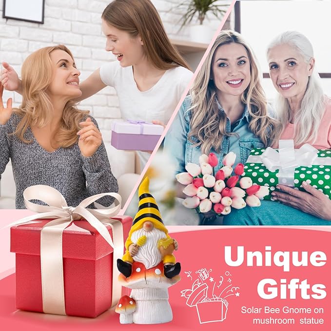 Solar Gnome Decor for Outside - Garden Beer Gnome Outdoor with Solar Lights, Sitting on Mushrooms - Perfect Housewarming or Women's Gifts (Yellow)
