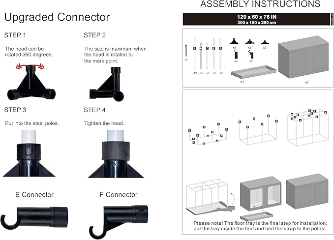 - Upgrade Design --- UPGRADED CONNECTOR--Durable PA Material Adopted, Anti-rust Reinforced Design, Adjustable Tightness According to The Pole, Hold Poles Tightly for Firmed Support. Multiple vents to accommodate fans and filter; ducting rectangle window with mesh to keep dust and insects out; Removable mylar floor tray easy to clean.
