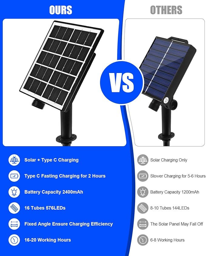 - Easy Operation: The solar panel collects sunlight throughout the day, automatically activating the solar lights at dusk and deactivating them at dawn, ensuring easy operation and energy efficiency. feature a rechargeable 1XAA 1.2V 2400mAh Ni-MH battery, it can be charged with type C cable in rainy and cloudy days
