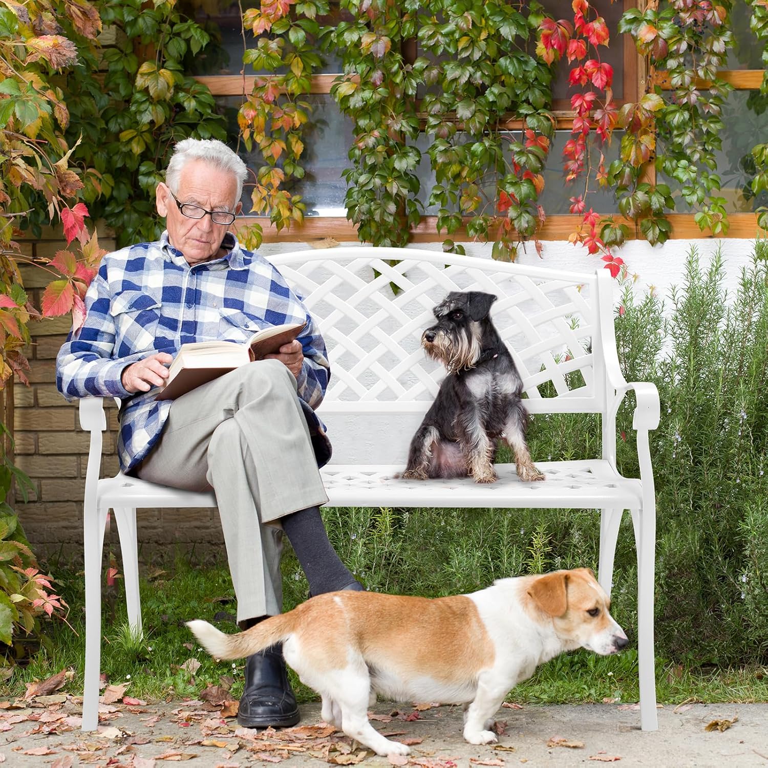 VINGLI 40.5" Patio Garden Bench,Anti- Rust Cast Iron Cast Aluminum Frame for Outdoor Path Yard Lawn Work Entryway Decor Deck (White)