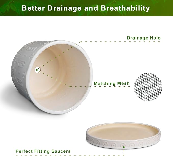 - Optimal Drainage: The plant pots with drainage holes and saucers ensures high and well water flow and air circulation, keeping your plants growth while avoiding excess water from spilling and staining your surfaces
