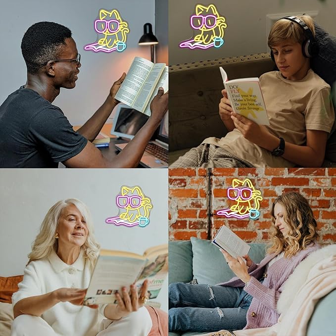- Ignite the joy in your life: Illuminate your life with this Reading Cat neon light, showcasing your passion for life and creating a unique atmosphere! Perfect for decorating man caves, bars, or bedrooms.