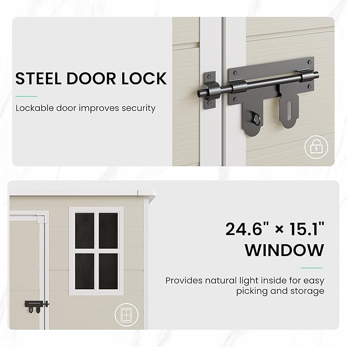 - STURDY FLOOR AND WINDOW: Equipped with a sturdy floor, our outdoor storage cabinet effectively prevents moisture from seeping into the structure, safeguarding your belongings from potential damage caused by dampness, mold, or rot. The window design facilitates ventilation and natural light. It allows the visibility of tools from the outside and enhances the aesthetics of the shed