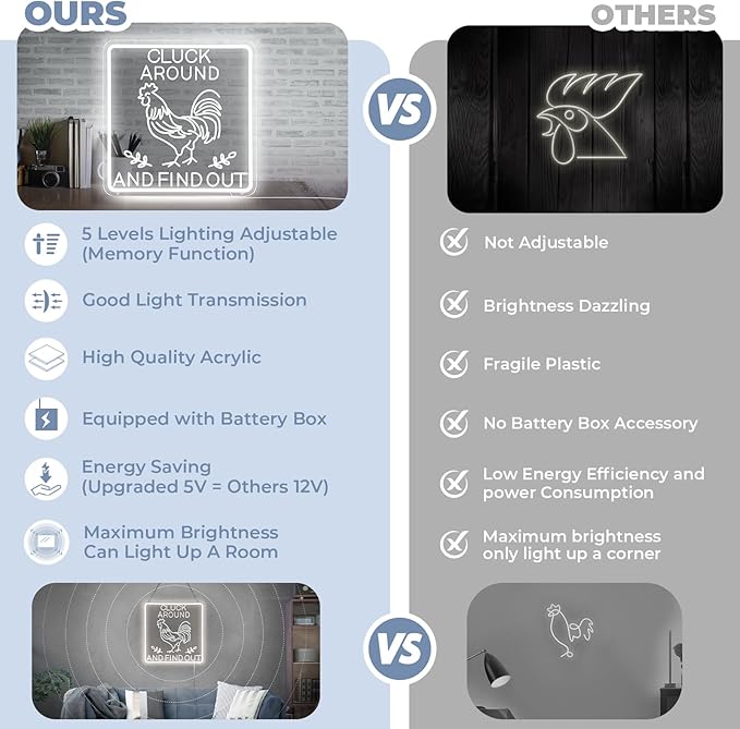 - 【Unique Design Neon Sign for Chicken Coop Decor】Designed with a rounded rectangular frame for safer use.16×16 Inch large sign make it more attractive.Bringing a striking ambiance to any setting, placing it in farmhouse wall,kitchen wall,garden fence,chicken coop.This rooster decor also can provide bright lighting for above occasions!The 3 levels of brightness can be adjusted to ensure that it meets your needs