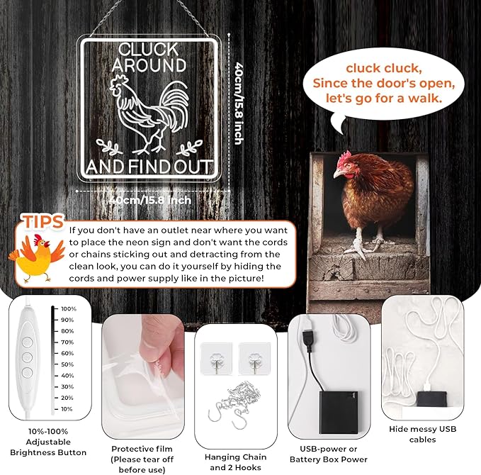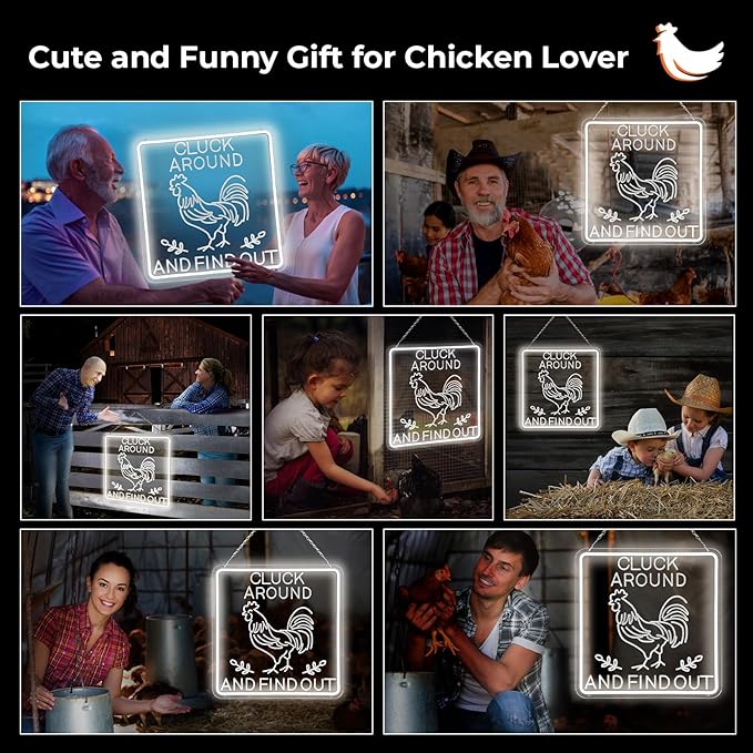 - 【Chicken Gift for Chicken Lover】It’s a rooster decor for people who love chicken,Create a humorous light and a nice light atmosphere for your chicken coop. If you don't understand what CLUCK AROUND AND FIND OUT.Ask your friends who have chicken, it's a very funny phenomenon in chicken keeping: if you give your chicken an inch to roam, they will take ten miles!