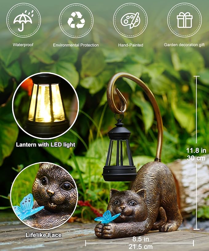 Solar Cat Garden Statue for Outdoor: Outside Sculptures Decor for Art Patio Balcony Yard Lawn – Unique Birthday Gift for Women Mom Grandma