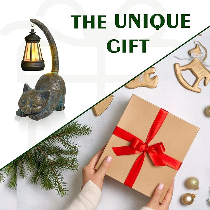 - Original Design: The size of the cat garden statue is 3.94''(W) x 6.69''(D) x 10.03''(H). Bronze cat with delicate textures and a lantern dangling from its tail. The light from the lantern mimics a vivid small flame and flickers in the darkness. NOTE: The cat's tail comes disassembled in the package and needs to be assembled for use.