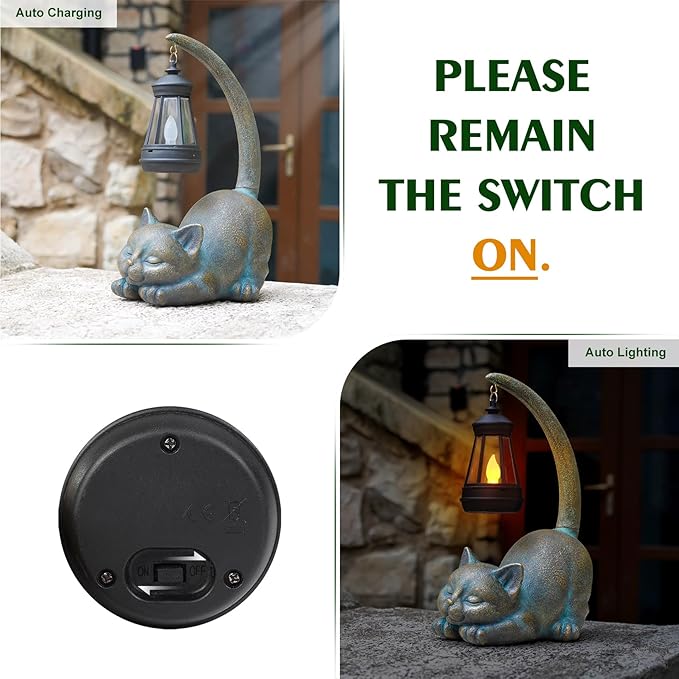 - Automatic Solar Charging: Turn on the switch and place the solar statue in sunlight for 6-8 hours of charging. It will light up automatically at night for 8-10 hours. The lantern is automatically photosensitive. NOTE: If you are not sure whether the button is turned on, please cover the lantern with your hand and keep out of the sun. If the switch is turned on, it will light up.