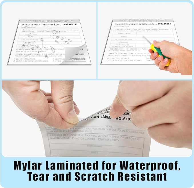 - Label Durability: The 2-ply vinyl DOT inspection labels with mylar lamination provide resistance to heat, tear, and puncture. The annual vehicle inspection stickers are easy to apply, write on, and long-lasting. Measuring 5" x 4", they are sequentially numbered for convenient alignment with inspection forms.
