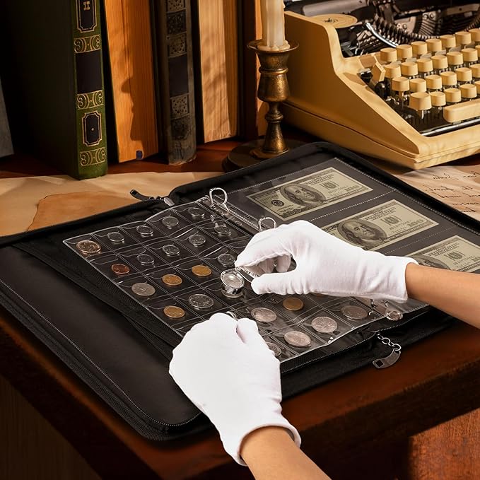 - [Perfect Gift for Coin Collectors] This fireproof coin albums comes with a portable high-definition 30x magnifying glass allowing you to clearly view intricate patterns, while the cotton white gloves to protect your pieces from damaging fingerprints and oils during handling. This coin book is Ideal for beginners, currency collectors