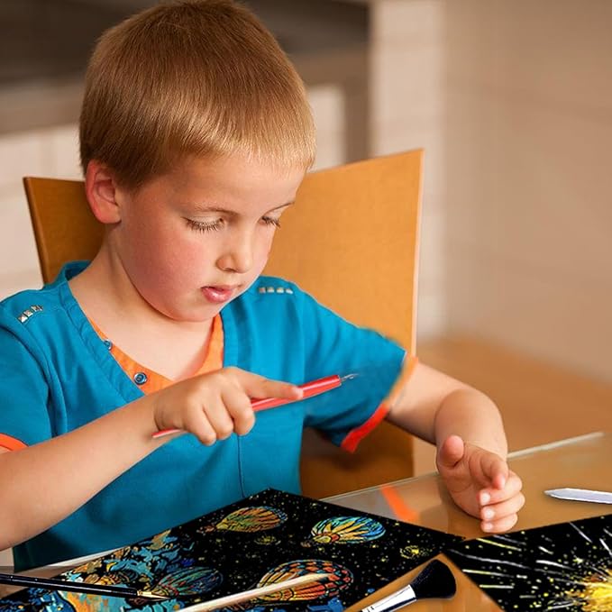 - Super Value Set: The package includes 8 sheets of glow in the dark scratch paper cards(29*21cm), 1 gold scratch pen, 1 red scraper, 1 black brush, 4 plastic scratch pen, 1 wooden stylus