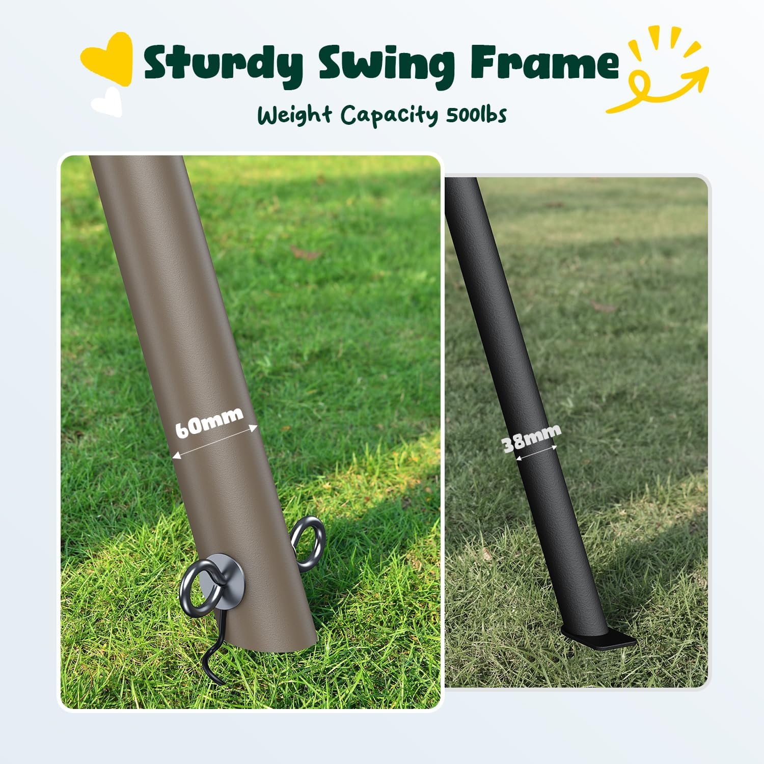 - 【7.5'-High Swing Frame】The 7.5'-High swing stand allows kids to swing higher and faster, offering an exciting experience. Whether you're looking for swing sets for backyard for kids 3-8 or big kids 8-12, this durable frame is designed to provide endless fun for toddlers, older kids, and even adults