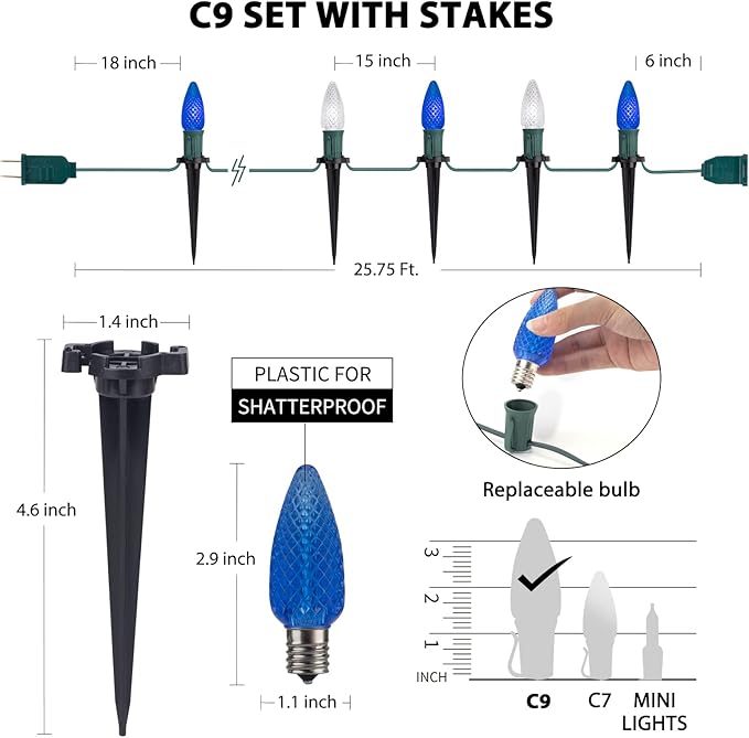 - Two Installation Ways: Hang up this C9 Christmas stakes lights around your roof line to outline entire house will be amazing, or plug the C9 Christmas lights with stakes alongside the walkway or lane in lawn or garden; These waterproof Christmas outdoor decorations lights for the yard comply with the rain test of UL certification and wonderful decorations for home, patio, garden